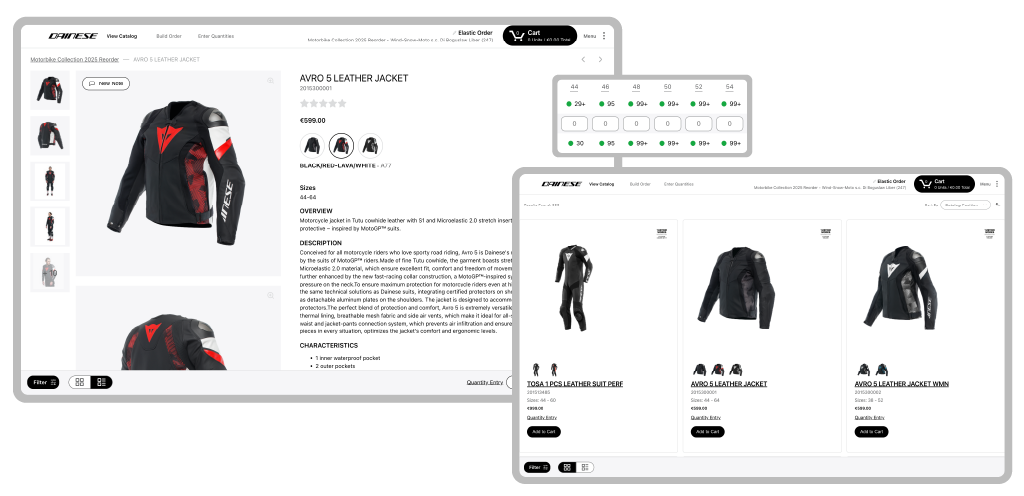 Another significant milestone for Dainese was the shift from printed to digital catalogs. By equipping their sales team with iPads pre-loaded with Elastic’s digital catalogs, Dainese eliminated the need for paper assets and made order collection more dynamic and interactive. This shift not only streamlined the ordering process but also aligned with Dainese’s broader goal of modernizing their operations and offering clients a more seamless experience.